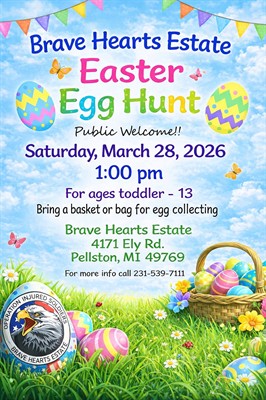 Brave Hearts Estate is hosting our Annual Easter Egg Hunt on Saturday, March 28, 2026 starting at 1pm. For toddlers through age 13. Bring a basket or bag for egg collecting. For more information call (231) 539-7111.
