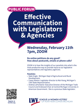 Do you ever communicate with your legislators but wonder if really matters? Are emails and calls effective? How about on-line petitions? ZOOM in to hear an expert panel with experience in Michigan government and politics share insights into the most productive ways to provide input to our legislative representatives and regulatory agencies.
