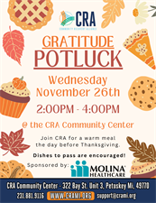 Come Bring a Dish to pass at the CRA Gratitude Potluck the day before Thanksgiving!Location - 322 Bay St Unit 3 Petoskey Mi 49770