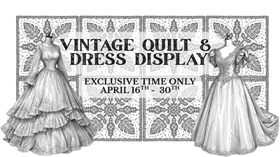 For a limited time only, April 16–30, explore a carefully curated collection of stunning quilts and wedding gowns spanning over 180 years of craftsmanship (1830–2011). Each piece tells a story—of love, family traditions, artistry, and the changing styles of generations past.